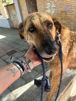 Cette brave mastine âgée d'un peu plus d'un an et demi, a été attrapée par les agents municipaux après qu'elle ait pris l'habitude de se réfugier dans une station service. Hésitante, presque timide au début, elle devient très vite accessible et affectueuse, adorant tout de même les jeux de "cache-cache" ou "attrape-moi si tu peux"...