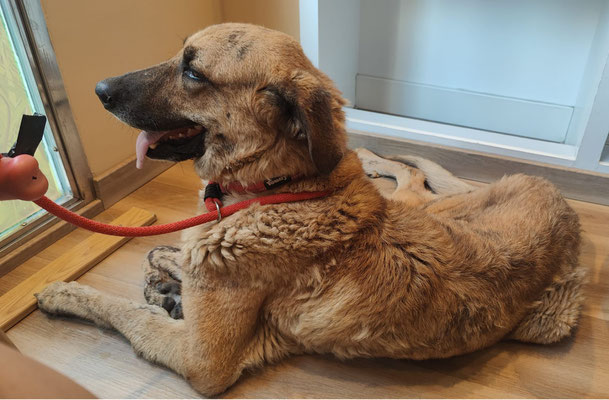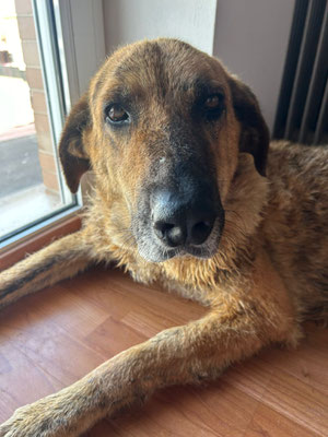 Mais au-delà de la prise en charge de son état de maigreur cachectique et de sa souffrance permanente, MERIDA mérite aussi amplement de connaître une nouvelle vie, d'être choyée et enfin respectée. Elle possède un caractère très doux, tranquille et sans la moindre rancune envers les humains qui l'ont ainsi maltraitée, elle montre une affection et une tendresse émouvantes. C'est une pauvre bête particulièrement attachante. Elle a été placée avec d'autres chiens qu'elle côtoie sans une once de réactivité, si soulagée d'avoir quitté son sordide enfermement.